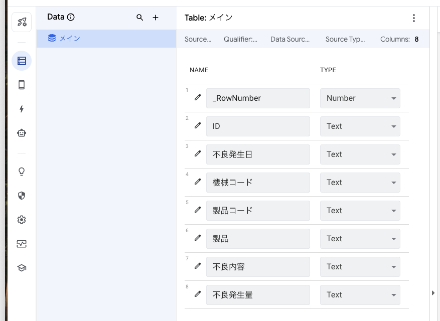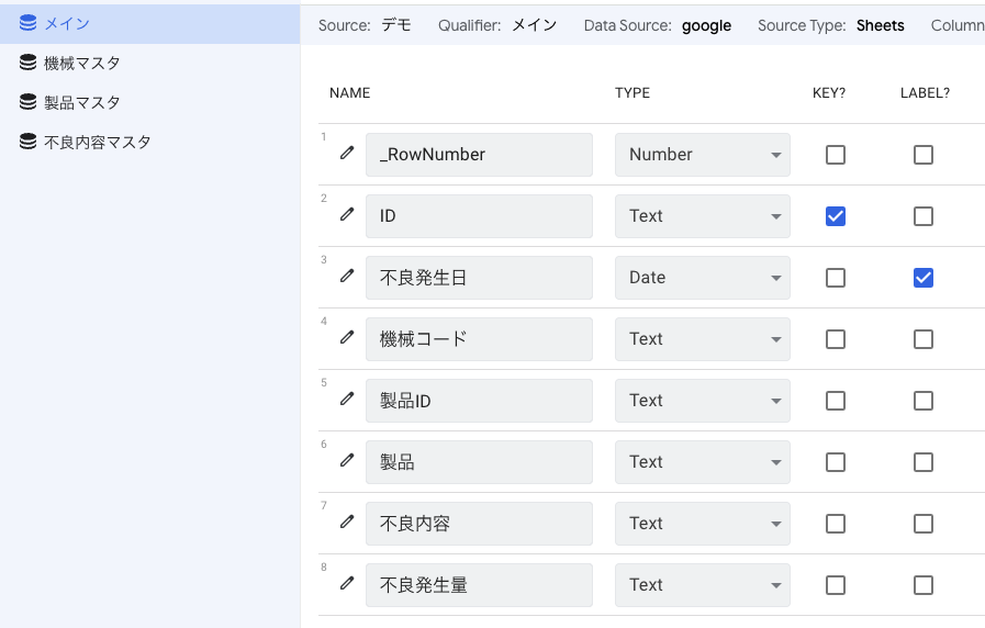 データ横のプラスマークをクリックして機械マスタ、製品マスタ、不良内容マスタのデータを追加して、不良発生日のTYPEをDateにしておきます。