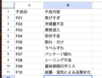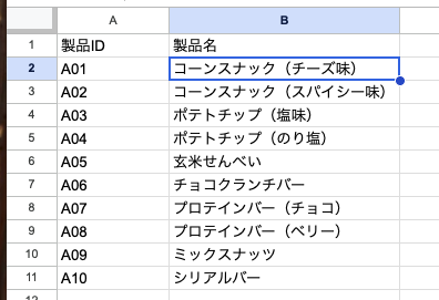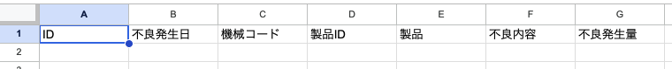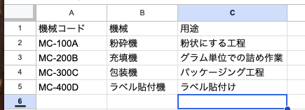 AppSheetで入力する際に選択式にするために作成しておきます。AppSheetの中で入力タイプをEnumにして選択式にすることもできますが、私はデータベース用のスプレッドシートを作成してそれと紐づけるようにしてます。こうすれば、データベースを更新すればそれに紐づけられている機械マスタや製品マスタの情報が同時に更新されるので、更新の手間が少なくなります。
