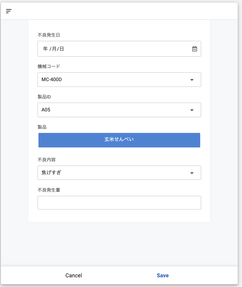 出来上がりはこの様な感じになります。不良発生日は欄の右側のカレンダーマークをクリックして選択でき、機械コードと製品ID、不良内容は右の下向き矢印をクリックするとリストが出る様になります。製品の欄は製品IDに連動したものが出てくるようになっています。