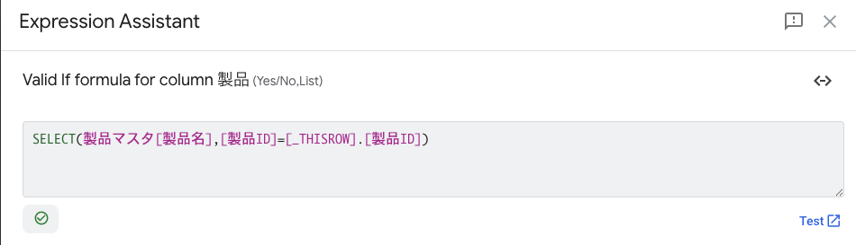 最後に製品名は製品IDに連動させたいのでValid If の欄に